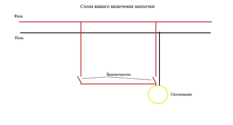 La connexion de deux ampoules à un interrupteur de passage est utilisée lors de l'éclairage de longs couloirs et tunnels, et pour cela, elles doivent être utilisées par paires, sinon le sens de leur utilisation est perdu. Voici un diagramme schématique pour une telle connexion. Toute installation doit également être effectuée via la boîte de jonction :