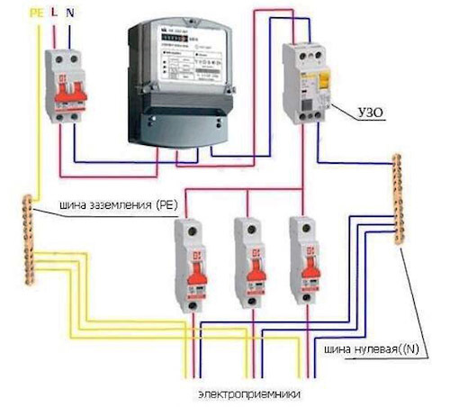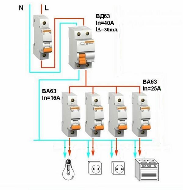 comment connecter un RCD dans un blindage - dans ce cas, le RCD protégera tout l'appartement dans son ensemble. Cette méthode est la plus simple pour connecter un RCD ;