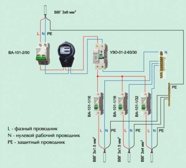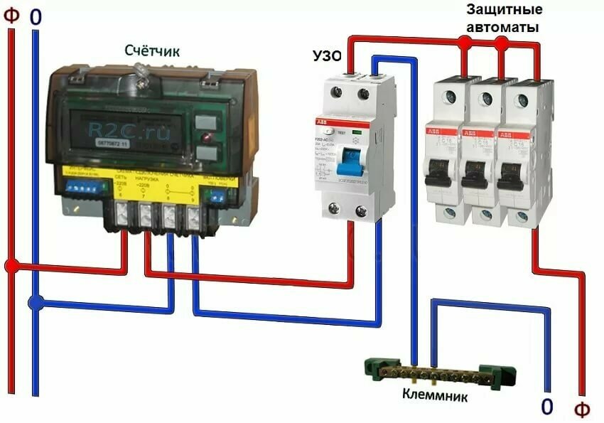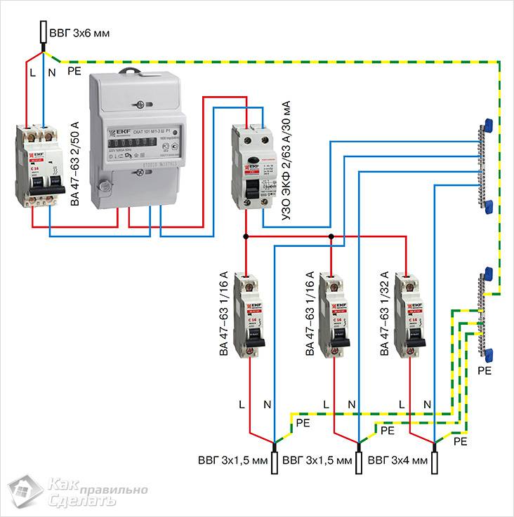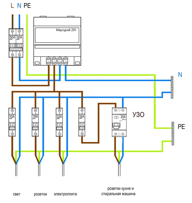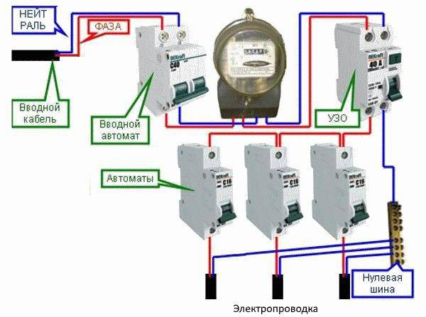 La part principale des solutions de circuits pour le secteur domestique est précisément le câblage monophasé, où, en principe, il n'y a que deux lignes: phase et zéro. Le schéma requis pour la connexion correcte d'un tel système dans la pratique est le suivant: Les travaux commencent toujours par l'installation d'un disjoncteur, par exemple, un modèle 40A est pris, le niveau de charge maximal qu'il peut supporter est de 8,8 kW.