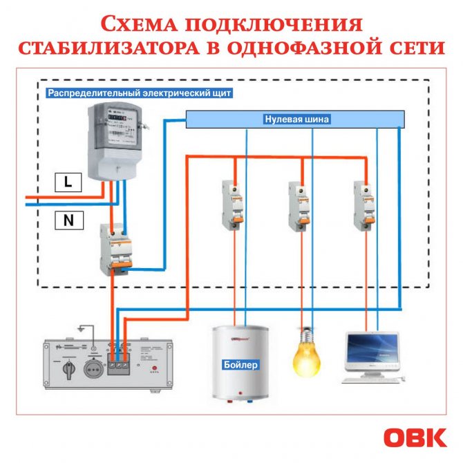 Pour les branches individuelles dotées d'équipements électriques puissants, des disjoncteurs sont installés qui répondront à la haute tension sans couper l'alimentation électrique dans toute la maison. Le schéma le plus courant pour connecter un RCD est celui qui est conçu pour un câble d'alimentation monophasé avec une tension de 220 volts.