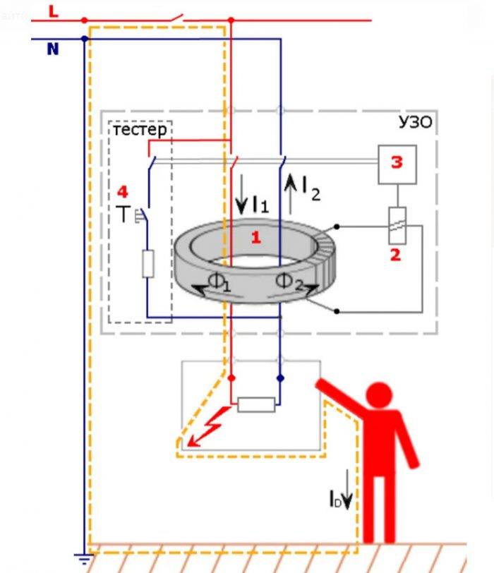 Pour connecter le RCD dans le blindage, deux conducteurs sont nécessaires. Selon le premier d'entre eux, le courant circule vers la charge et selon le second, il quitte le consommateur le long du circuit externe.