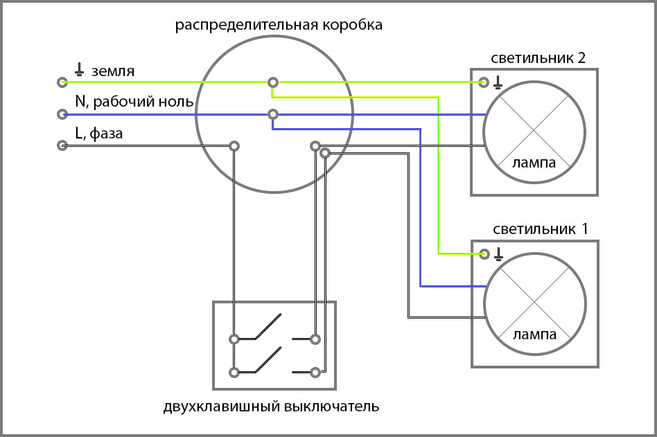 Pour construire un circuit avec deux interrupteurs à touche unique, un câble à trois conducteurs est utilisé. Dans ce cas, mise à la terre, "zéro" s'affiche sur la source lumineuse. Et la phase surlignée en marron dans le diagramme fournit de l'énergie. Il traverse à la fois les interrupteurs et la lampe.
