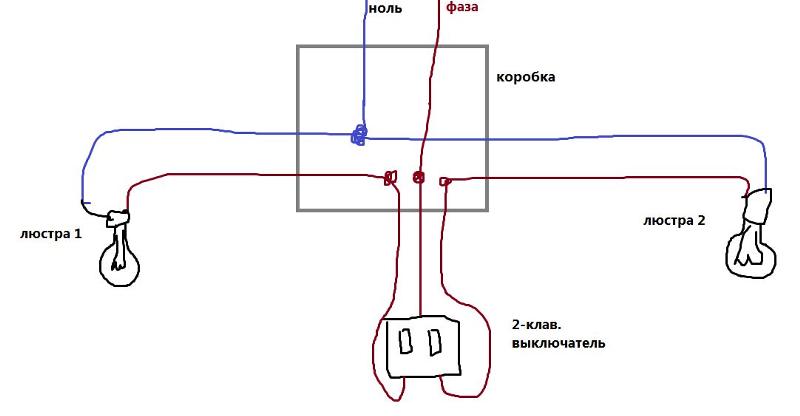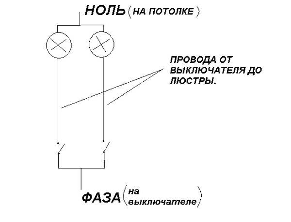 La méthode de connexion est assez simple, même s'il y a plus d'une ou deux ampoules dans le lustre. Il est beaucoup plus facile de le faire si des fils de deux couleurs sortent du lustre. Dans ce cas, les fils de la même couleur sont torsadés ensemble, formant ainsi une ligne à 2 fils. La figure ci-dessous montre un schéma d'allumage d'un lustre à un seul interrupteur.