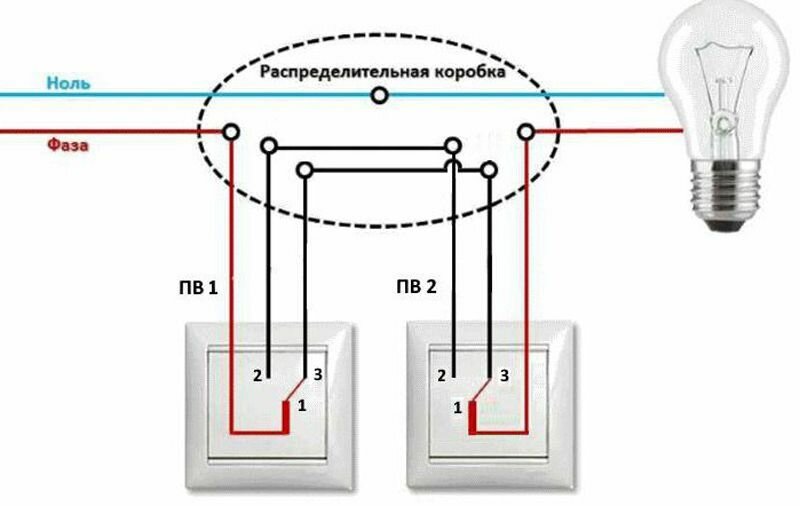Une version répandue du schéma en trois points: N - zéro électrique; L est la phase électrique ; ПВ1 - le premier interrupteur à deux touches; ПВ2 - le deuxième interrupteur à deux touches; PV3 - interrupteur croisé
