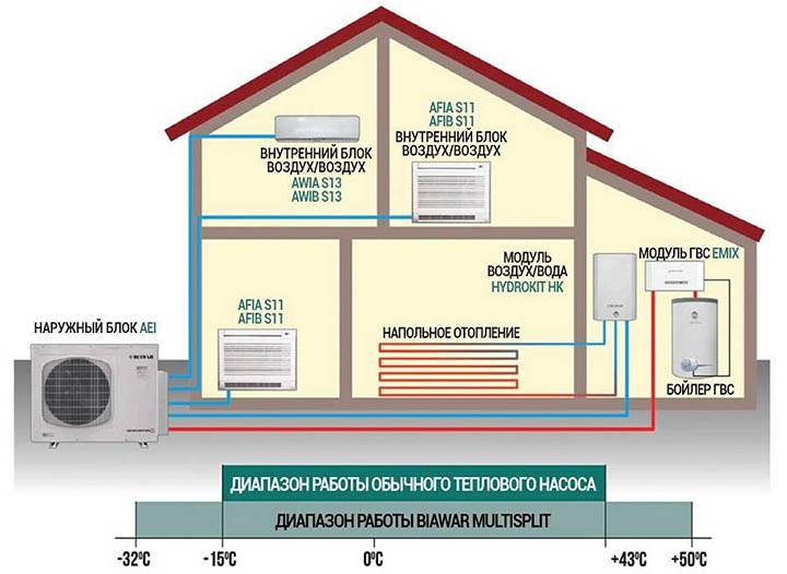 - Climatiseur. Peu de gens se rendent compte que le climatiseur chauffe bien l'air pendant la saison froide. Dans le même temps, son installation nécessitera un minimum de temps, contrairement à la chaudière. Cependant, l'inconvénient d'un tel équipement est le coût élevé de l'entretien, ainsi que le chauffage d'un petit nombre de mètres carrés de la pièce.
