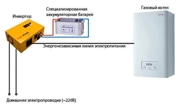 L'onduleur pour les équipements à gaz dans sa puissance doit dépasser celui de la chaudière et avoir une marge supplémentaire de 50%. Étant donné que l'alimentation de la chaudière consomme en moyenne jusqu'à 60 W et la pompe - jusqu'à 120 W, la plupart des échangeurs de chaleur domestiques ont besoin de 180 W d'énergie.
