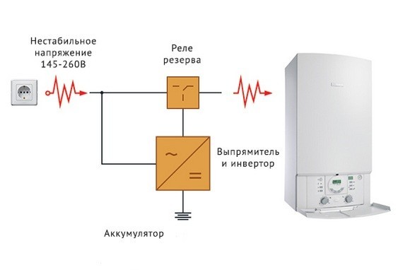 Les dispositifs d'alimentation de secours constituent un grand groupe de dispositifs peu coûteux qui n'assurent qu'une transition vers la batterie sans égaliser les paramètres de tension secteur. Ils se composent d'un redresseur, d'un convertisseur, d'une batterie et d'un appareil de commutation. En mode de sécurité, l'unité de commande électronique de l'équipement de chauffage et la pompe sont alimentées directement par le secteur. Lorsque l'alimentation principale tombe en panne, le commutateur connecte l'alimentation de secours via l'onduleur-convertisseur.
