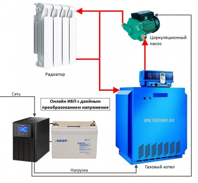 Une alimentation sans coupure interactive en ligne pour une chaudière de chauffage diffère d'un onduleur de secours en présence d'un stabilisateur intégré.Si dans le système d'alimentation hors ligne, la transition vers la batterie est effectuée même avec de petites surtensions à l'entrée, la source interactive peut alors fonctionner avec des fluctuations de tension suffisamment importantes dues au stabilisateur, de sorte que sa fiabilité est plus élevée.