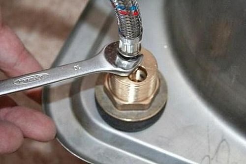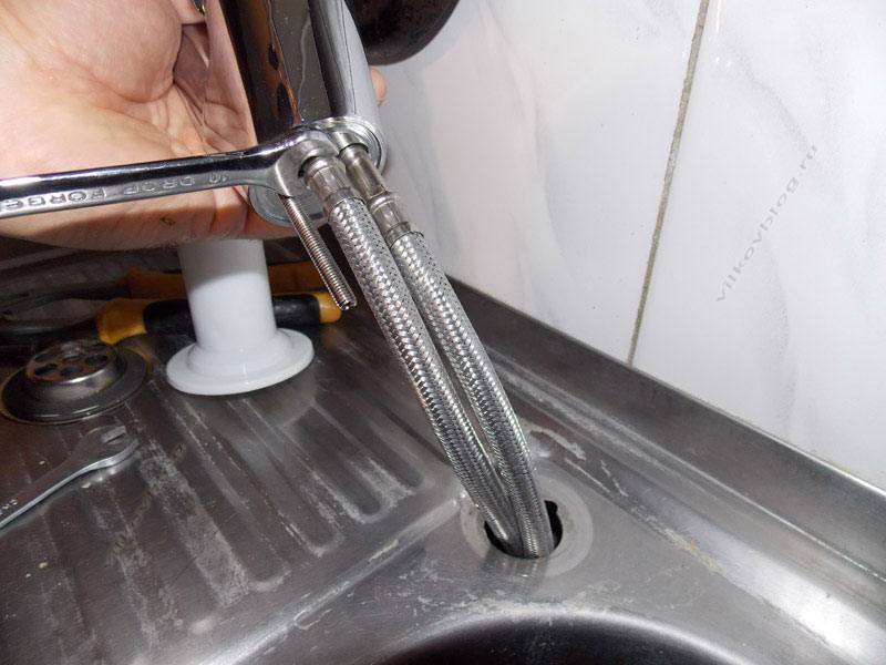 À l'aide d'une clé à fourche, des tuyaux d'eau flexibles sont installés dans les trous filetés du corps du robinet.