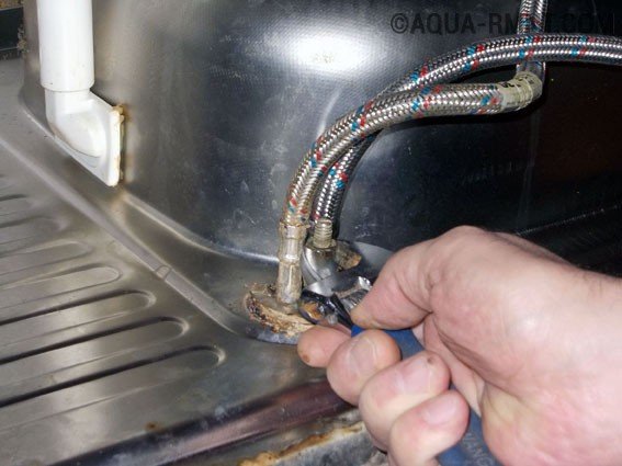 Dans cette situation, le processus sera considéré, où la grue est remplacée cuisine en utilisant de vieux tuyaux métalliques et sans démonter l'évier.Après avoir maîtrisé cette option particulière, vous ne pouvez pas avoir peur de tels travaux et installations sur de nouveaux systèmes à l'avenir.