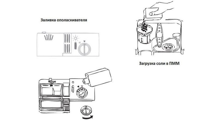 Le sel spécial lave-vaisselle contient des ingrédients conçus pour pour adoucir l'eau du robinet l'eau, empêchant l'apparition de tartre sur le radiateur électrique (chauffage), ainsi qu'un meilleur lavage de la vaisselle. Pour le sel, un réservoir spécial est fourni - un échangeur d'ions, dans lequel il doit être rempli.