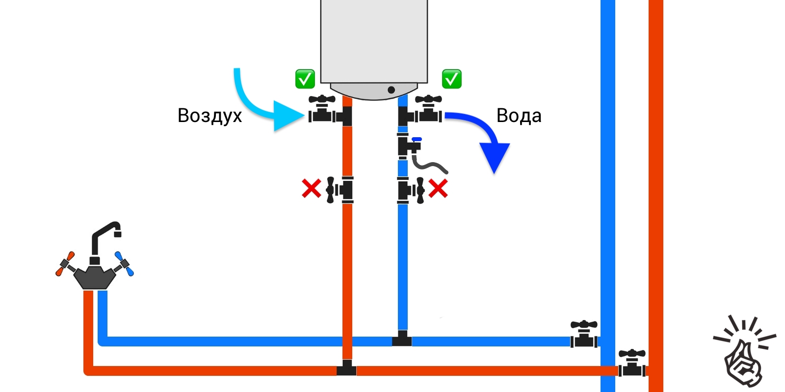 - Après avoir terminé les manipulations avec de l'eau froide, procédez de la même manière avec de l'eau chaude en dévissant la vanne du tuyau correspondant. L'eau s'écoulera rapidement lorsque le réservoir commencera à se remplir d'air.