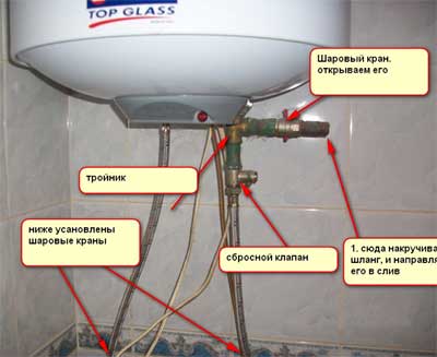 Avez-vous commencé à vidanger l'eau du chauffe-eau par le robinet de vidange situé sur le tuyau d'alimentation en eau froide ? Ensuite, vous pouvez rencontrer un problème lorsque l'eau s'écoule à peine ou pas du tout. Il convient de noter que cette grue elle-même n'est pas très productive. Si vous souhaitez vidanger l'eau le plus rapidement possible, installez ici un té avec une branche, qui jouera le rôle d'un robinet de vidange.