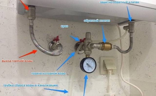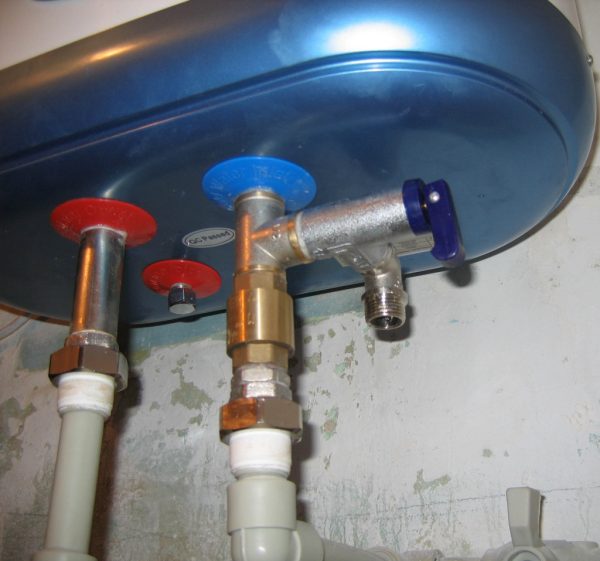 Ici, la soupape de décharge est installée sur l'alimentation en eau froide, mais comme vous pouvez le voir, elle n'est pas connectée à la chaudière, mais au té, et le té est déjà connecté au filetage de l'entrée de la chaudière à eau froide, un robinet est vissé dans la sortie latérale du té, ici c'était fait un peu inesthétique, ça aurait pu être à la place d'un robinet et tuyau en fer installer un robinet avec filetage extérieur et ce serait sympa, et moins de raccords.