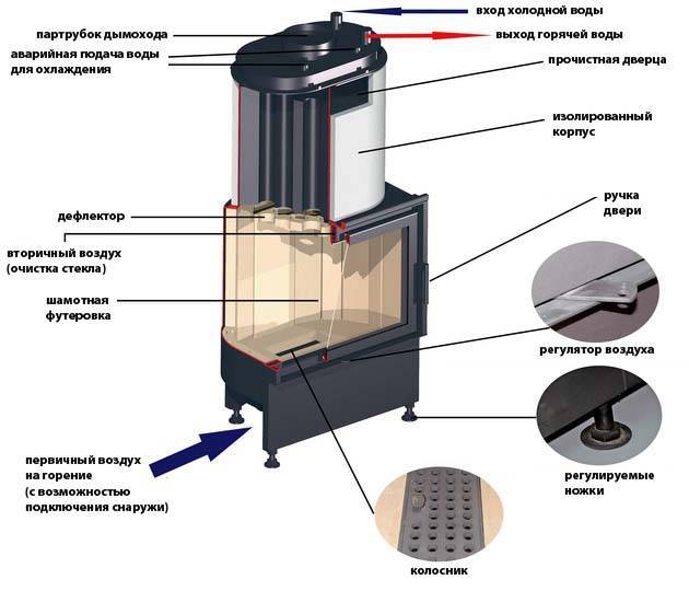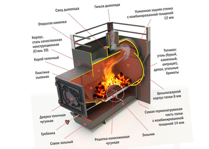 La chambre de combustion, partie obligatoire de toute unité, est un compartiment conçu pour le combustible solide. Un ventilateur est disposé sous le foyer, qui fournit l'apport d'oxygène nécessaire au maintien du processus de combustion, et de plus, les cendres de bois brûlé s'y accumulent.