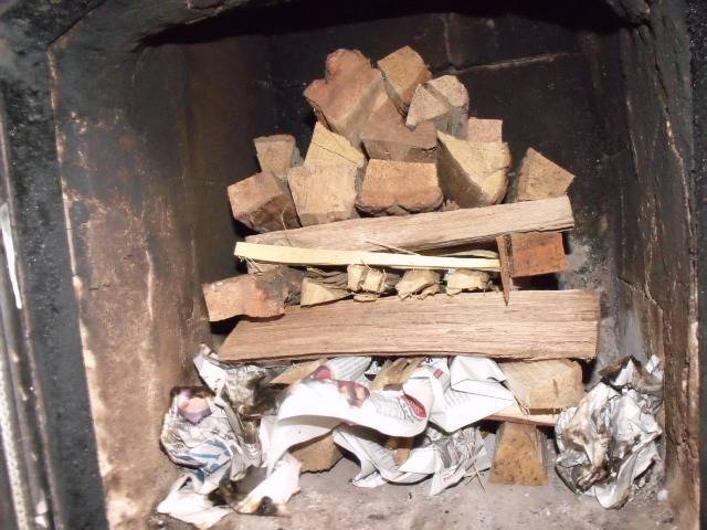 - à partir de bûches minces, faites un signet pour environ 2/3 du volume du four. Le bois de chauffage peut être plié dans une "maison" ou en travers, créant des espaces pour l'air. C'est là que les shorties, qui ont été mentionnés plus tôt, sont utiles ;