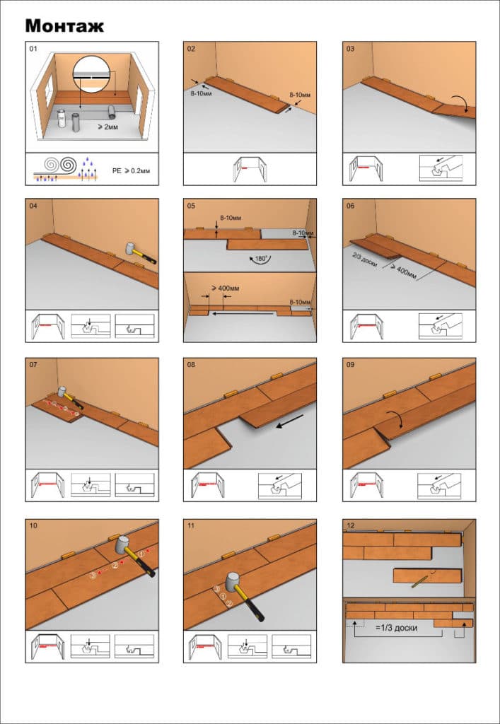 - OK. Il existe deux méthodes de montage. La première implique l'articulation d'éléments avec un chevauchement. La seconde est lorsque deux plaques adjacentes sont placées côte à côte. Par de légers coups de marteau sur le liner, ils s'assurent que la pointe pénètre dans la rainure jusqu'au déclic caractéristique.