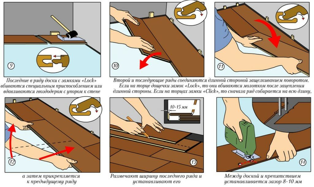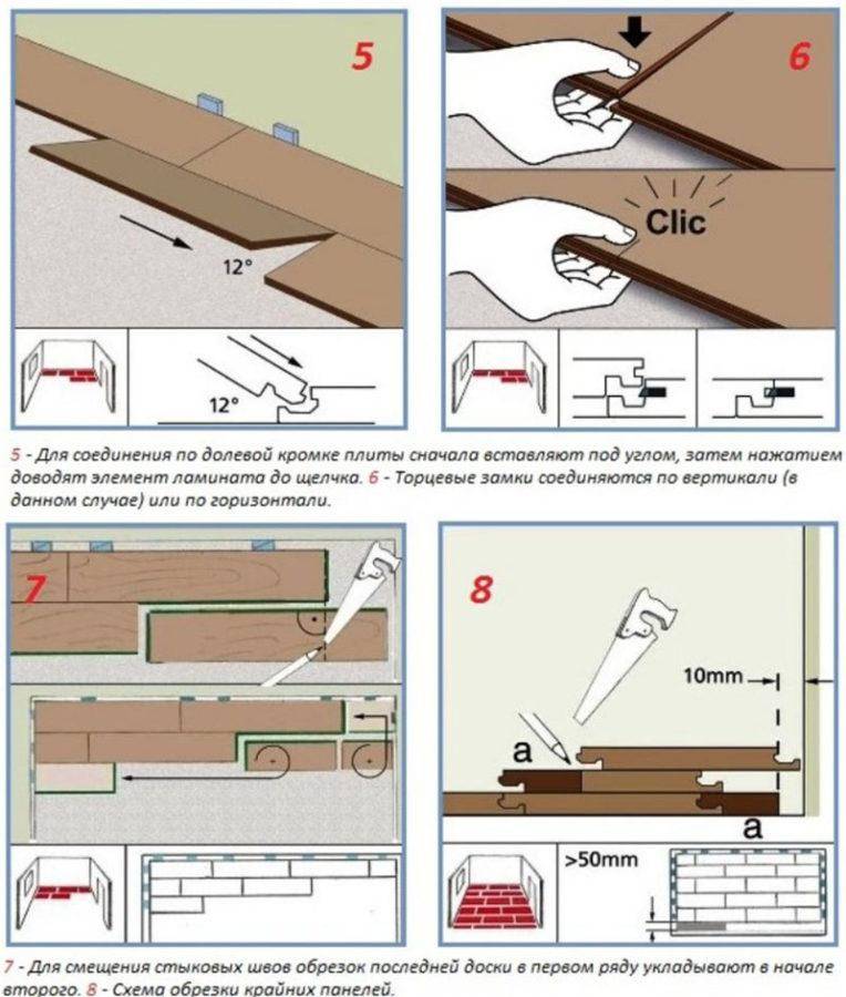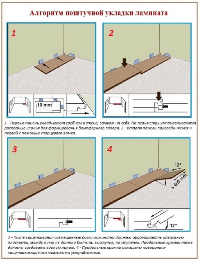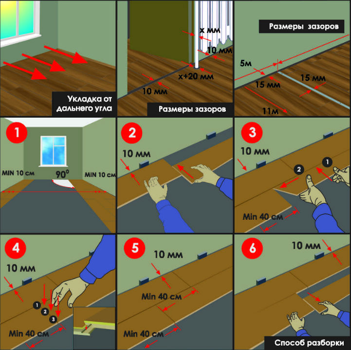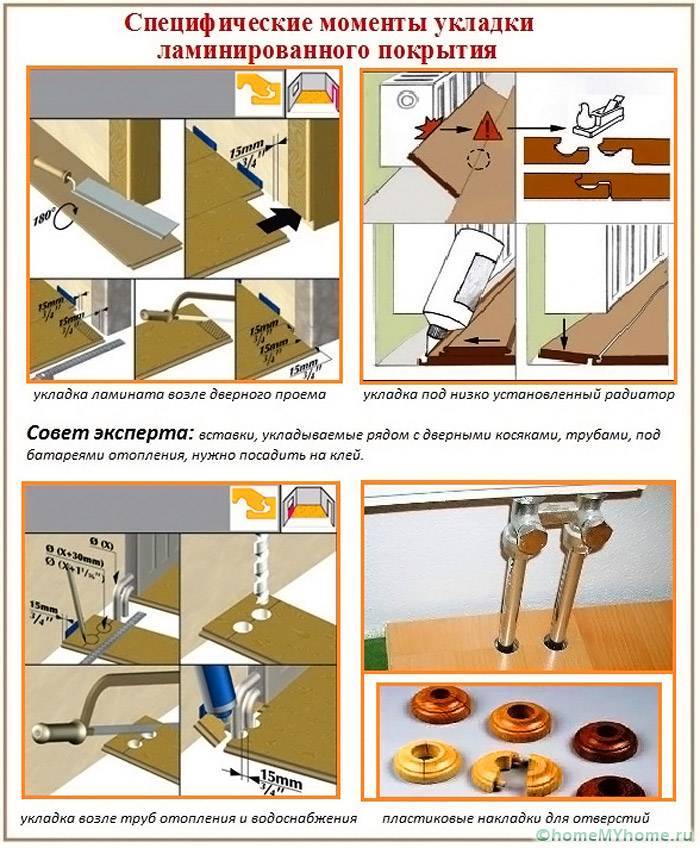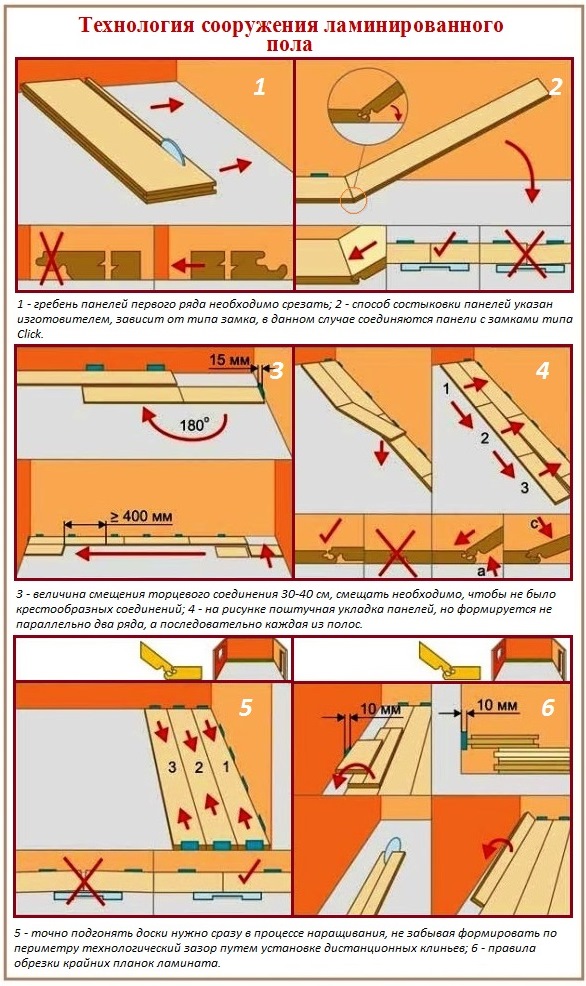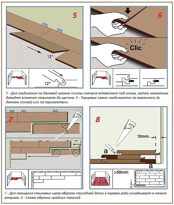 Pour toutes les adjonctions au mur, un écart de déformation de 8 à 10 mm est observé. Après avoir assemblé le stratifié et séché la colle, les cales sont retirées, le socle est monté. Les connexions au seuil de porte ou aux étages des pièces voisines sont masquées par des superpositions. Un revêtement correctement assemblé n'a pas de fissures et de fissures, il sert au moins la période spécifiée par le fabricant.