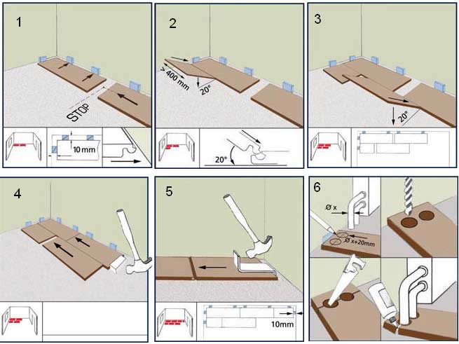 Les résidus de colle doivent être enlevés avec un chiffon humide. Après avoir posé trois ou quatre rangées, vous devez faire une pause de 2 à 3 heures. Ensuite, nous continuons le processus jusqu'à ce que la surface soit complètement posée. Lors de la pose de la dernière rangée, il vaut la peine d'utiliser un pied de biche pour relier les rangées. Mais ils doivent travailler avec soin afin de ne pas endommager le panneau ou le mur.Si le sol est traversé par des tuyaux de chauffage, il convient de réaliser un gabarit en papier qui est transféré sur la feuille à installer. Tous les trous nécessaires sont découpés avec une scie sauteuse. Vous ne devez pas oublier la nécessité d'espaces entre les feuilles et le mur, les feuilles et la porte.
