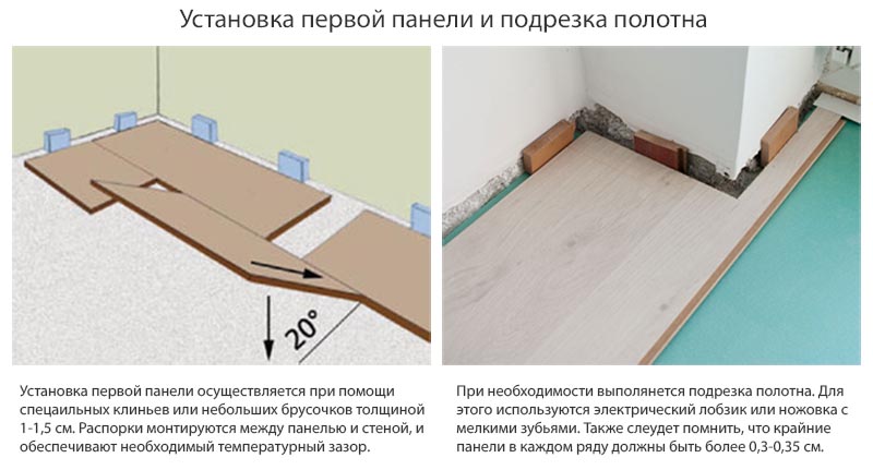 - Prédécoupez le peigne et disposez la première rangée de planches. Le verrou de la planche doit être dirigé vers vous et le côté coupé doit être dirigé vers le mur.