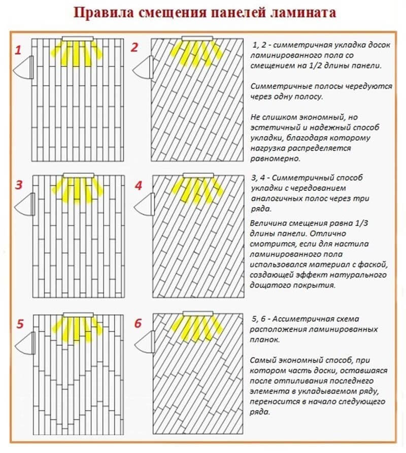 La séquence deviendra également claire lorsque le travail est effectué du coin le plus à gauche vers lui-même. Il est nécessaire de conduire la première bande sur le mur opposé, puis de répéter la procédure, mais en conservant le "pansement". Cela peut être fait selon le principe de la maçonnerie, lorsque le joint de la rangée suivante tombe au milieu de la précédente. Un déplacement constant des articulations de 20 à 15 cm est également autorisé, ce qui forme une sorte de "chevron".Cette option a fière allure lorsque la texture du stratifié imite un bord de navire.