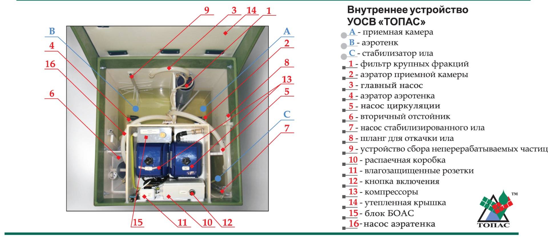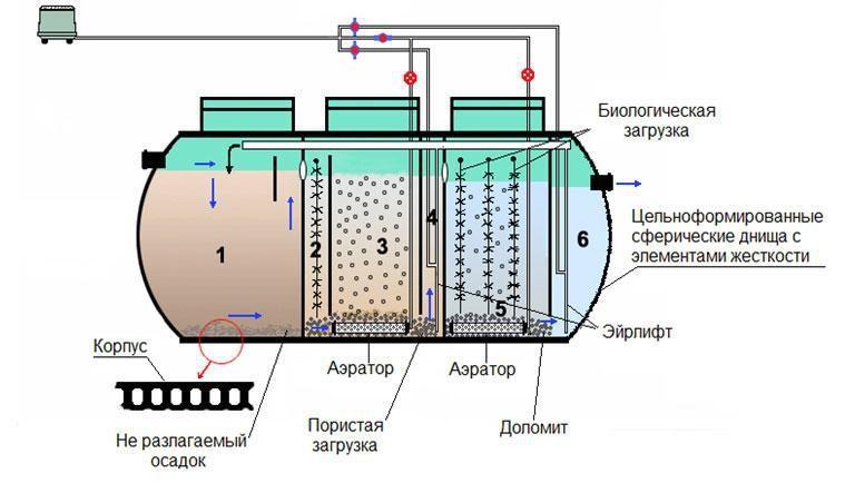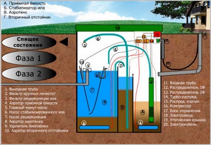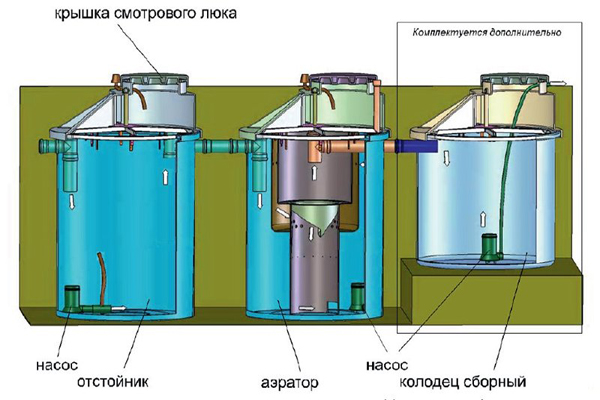La présence du soi-disant aérotank dans la fosse septique vous permet d'élargir l'ensemble des espèces biologiques de micro-organismes en incluant des bactéries aérobies dans le travail. Ils vous permettent d'accélérer le processus de nettoyage des eaux usées, mais pour cela, leur habitat doit être saturé d'oxygène. Mais un incident intéressant est lié aux bactéries aérobies : à un certain moment, leur population devient si nombreuse que les réserves de nourriture s'épuisent et la colonie s'éteint tout simplement. Pour relancer le fonctionnement du bassin d'aération, une partie des boues activées du décanteur primaire y est ajoutée. De plus, le système de pompage des boues vous permet d'éliminer les résidus minéraux usés et de les accumuler dans un récipient, facilitant ainsi le nettoyage de la fosse septique elle-même.
