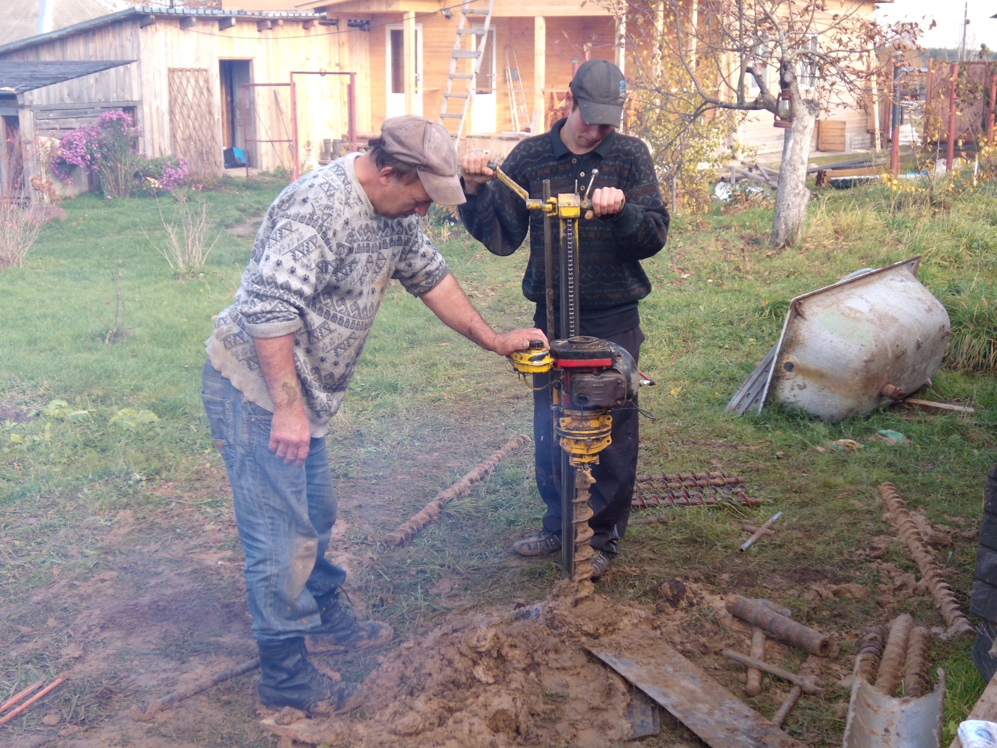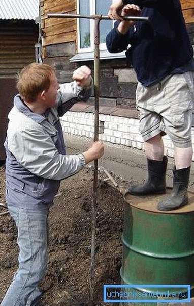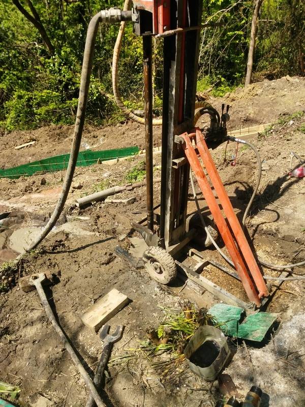 Deuxième étape. Ceci est suivi d'un pré-perçage avec une simple perceuse de jardin. Après environ un demi-mètre, la perceuse est prolongée avec un tuyau ø12 cm (des boulons et des raccords d'un tuyau d'un diamètre légèrement inférieur sont utilisés pour la connexion).