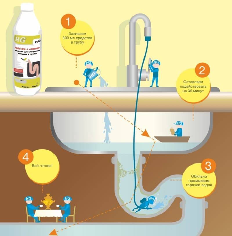 Utilisez des produits chimiques conformément aux instructions sur l'emballage. Habituellement, le schéma est le suivant: la substance est versée (versée), laissée pendant un moment et lavée à l'eau. Par exemple, avant d'utiliser la "Taupe", vous devez mettre de l'eau bouillante dans le drain, et après la fin du produit, rincer le drain avec un jet froid.