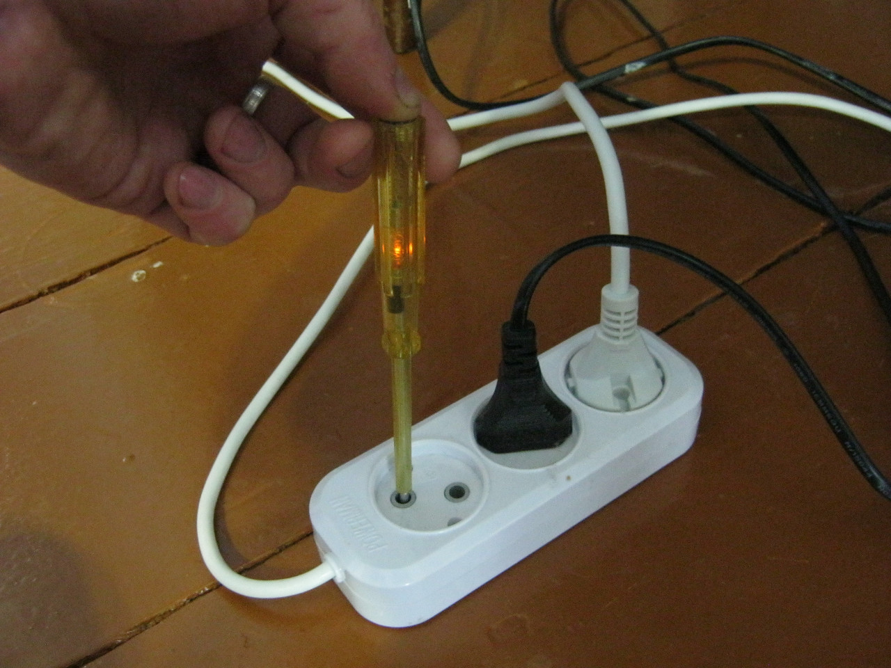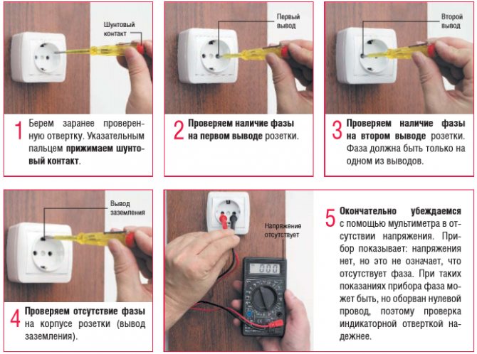 Pour ce faire, il est nécessaire de déterminer sur quel fil se trouve la phase, ce qui est fait par un indicateur de tension. Dans ce cas, si la phase se trouve sur deux fils, alors le réseau est défaillant.