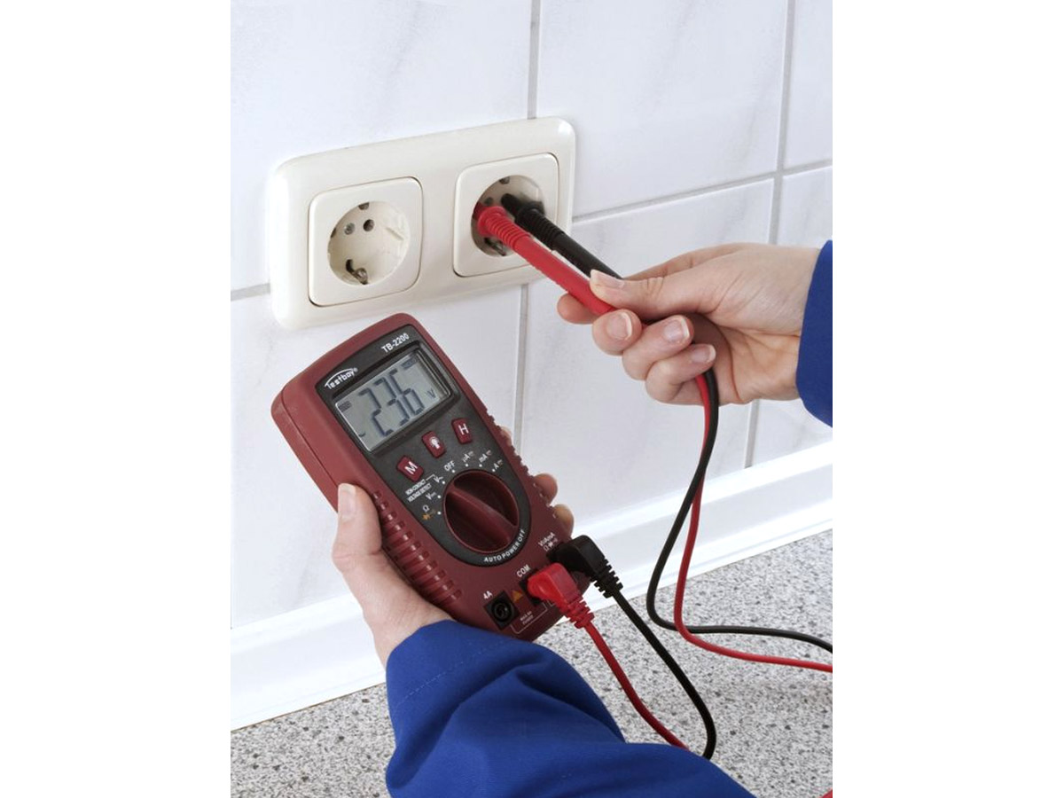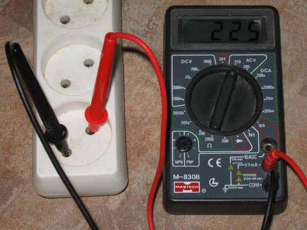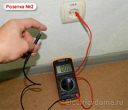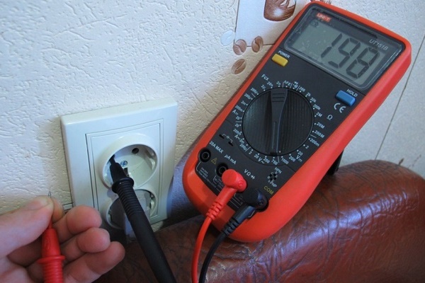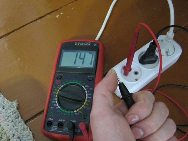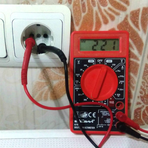 Pour mesurer la tension dans la prise avec un testeur numérique, vous devez insérer les sondes dans les prises des prises, la polarité n'a pas d'importance, l'essentiel est de ne pas toucher les parties conductrices des sondes avec vos mains.