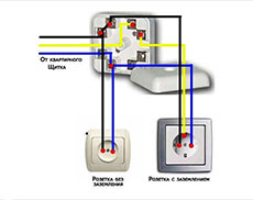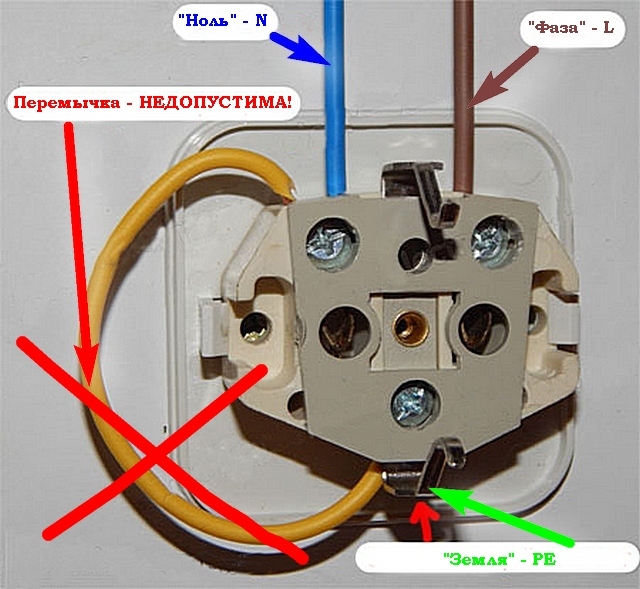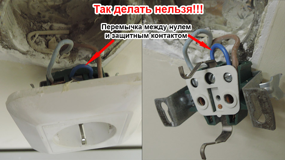 Il est possible de détecter seulement deux fils entrant dans l'appartement, mais en même temps, lors de l'examen des prises, on peut voir que les contacts de mise à la terre et le fil neutre sont court-circuités par un cavalier. Cette option de connexion s'appelle la mise à zéro, mais il est interdit de l'utiliser par les règles du PUE, car en cas de court-circuit, la tension apparaît immédiatement sur les boîtiers de l'instrument et il y a une forte probabilité de choc électrique pour une personne .