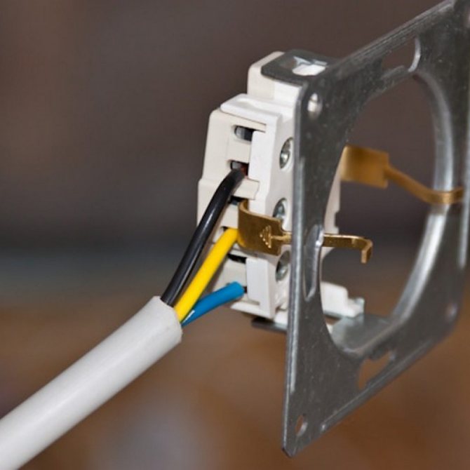 Ensuite, la prise elle-même est démontée - ici, vous devez regarder combien de fils sortent du mur et de quelle couleur ils sont. Selon les normes, la phase est connectée avec un fil marron (noir, gris, blanc), zéro bleu et mise à la terre avec deux couleurs jaune-vert.Dans les maisons plus anciennes, il peut s'agir simplement d'un fil unicolore à deux ou trois fils. Si seuls deux fils sont utilisés, cela indique clairement l'absence de mise à la terre. Si trois fils sortent, une vérification supplémentaire sera nécessaire.