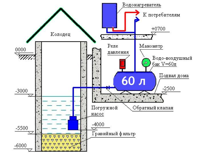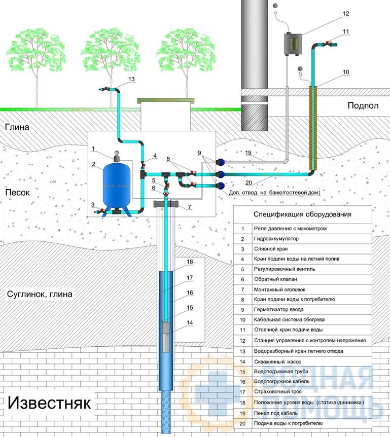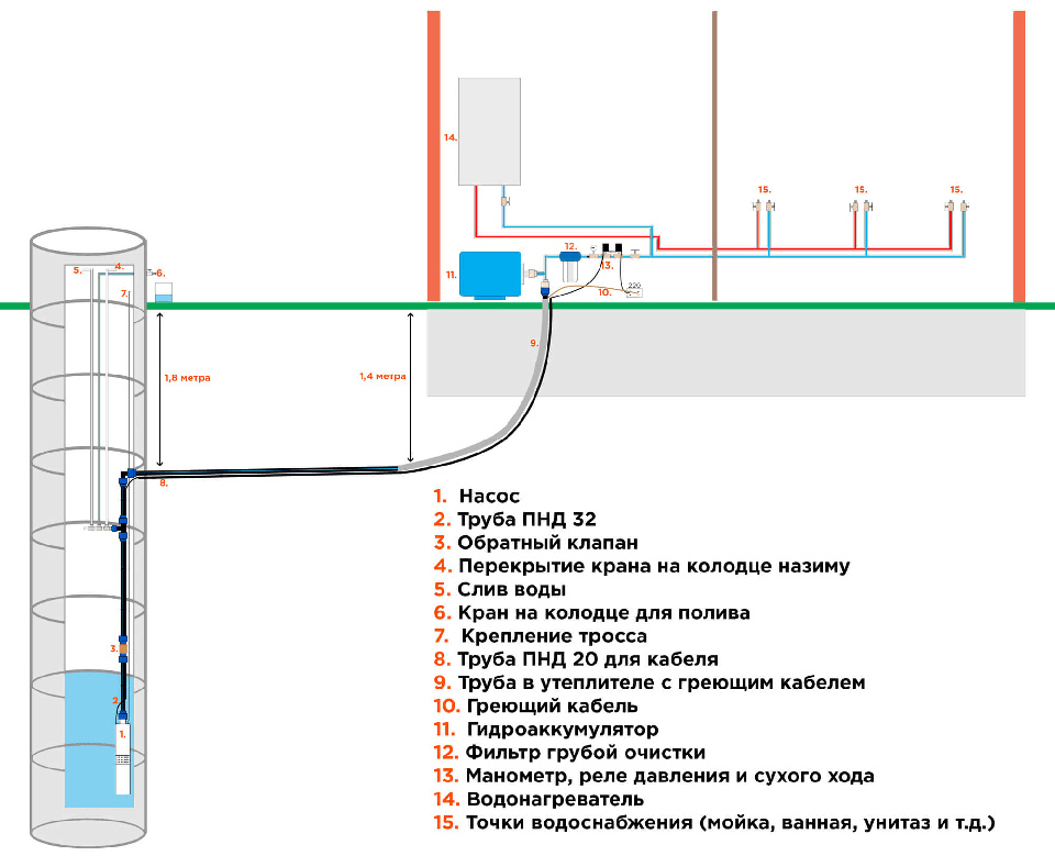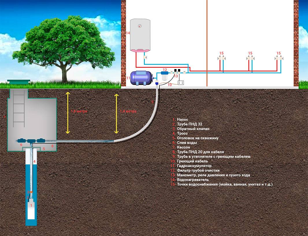 Un puits est l'une des principales sources d'eau utilisée depuis l'Antiquité.À l'aide de pompes centrifuges, l'eau est amenée à la surface. Il est également possible de fournir de l'eau chaude et froide avec des pompes vibrantes submersibles. La profondeur du puits est établie sur la base des données d'exploration géologique de la zone au stade de la conception des communications de la maison.