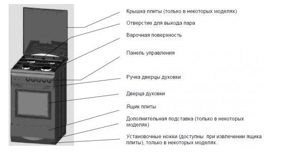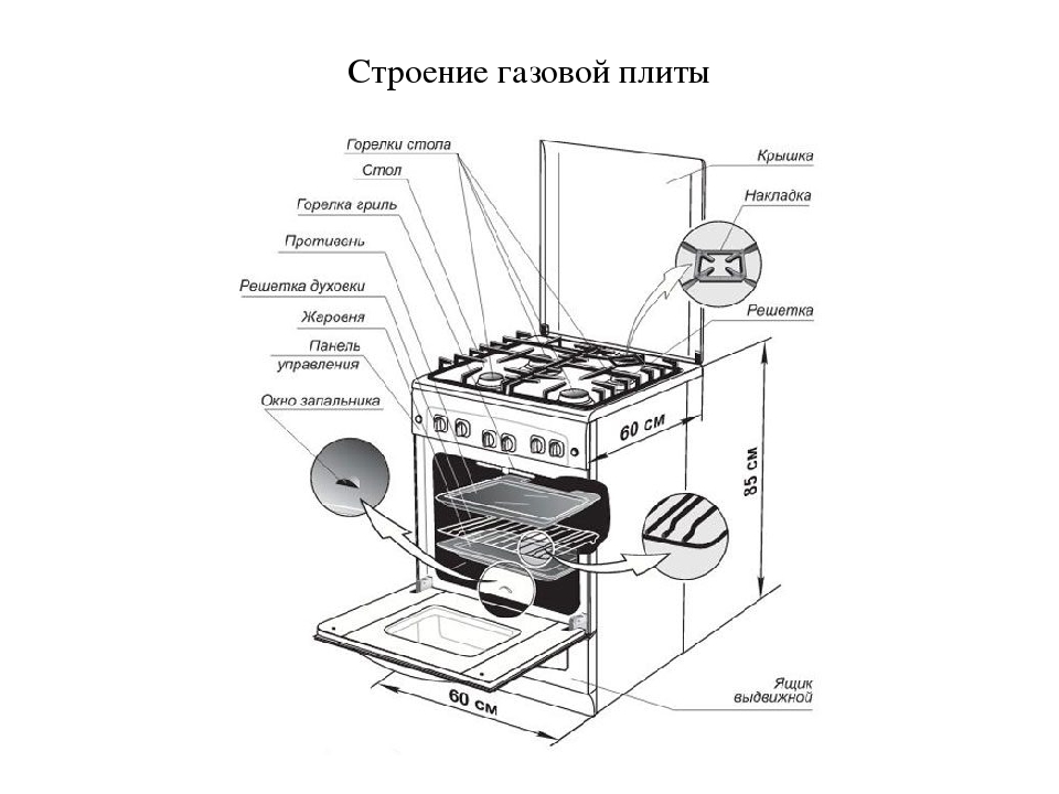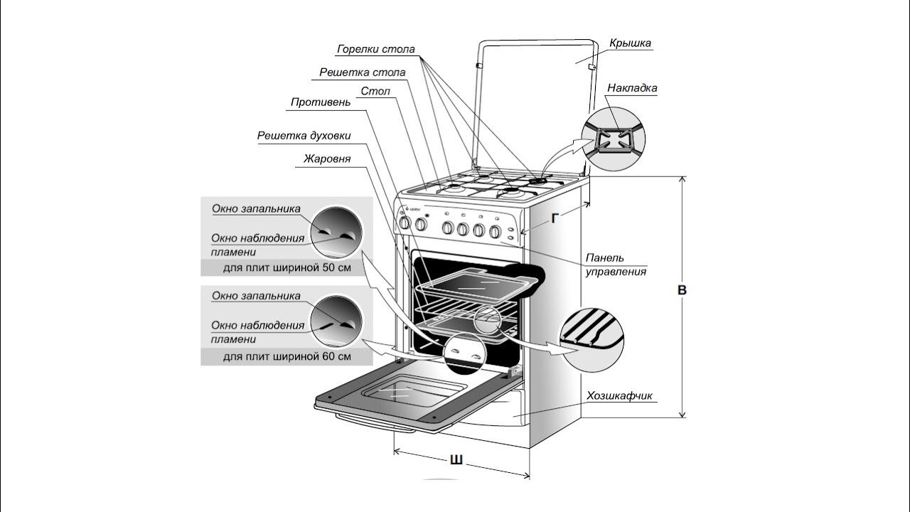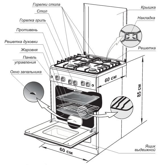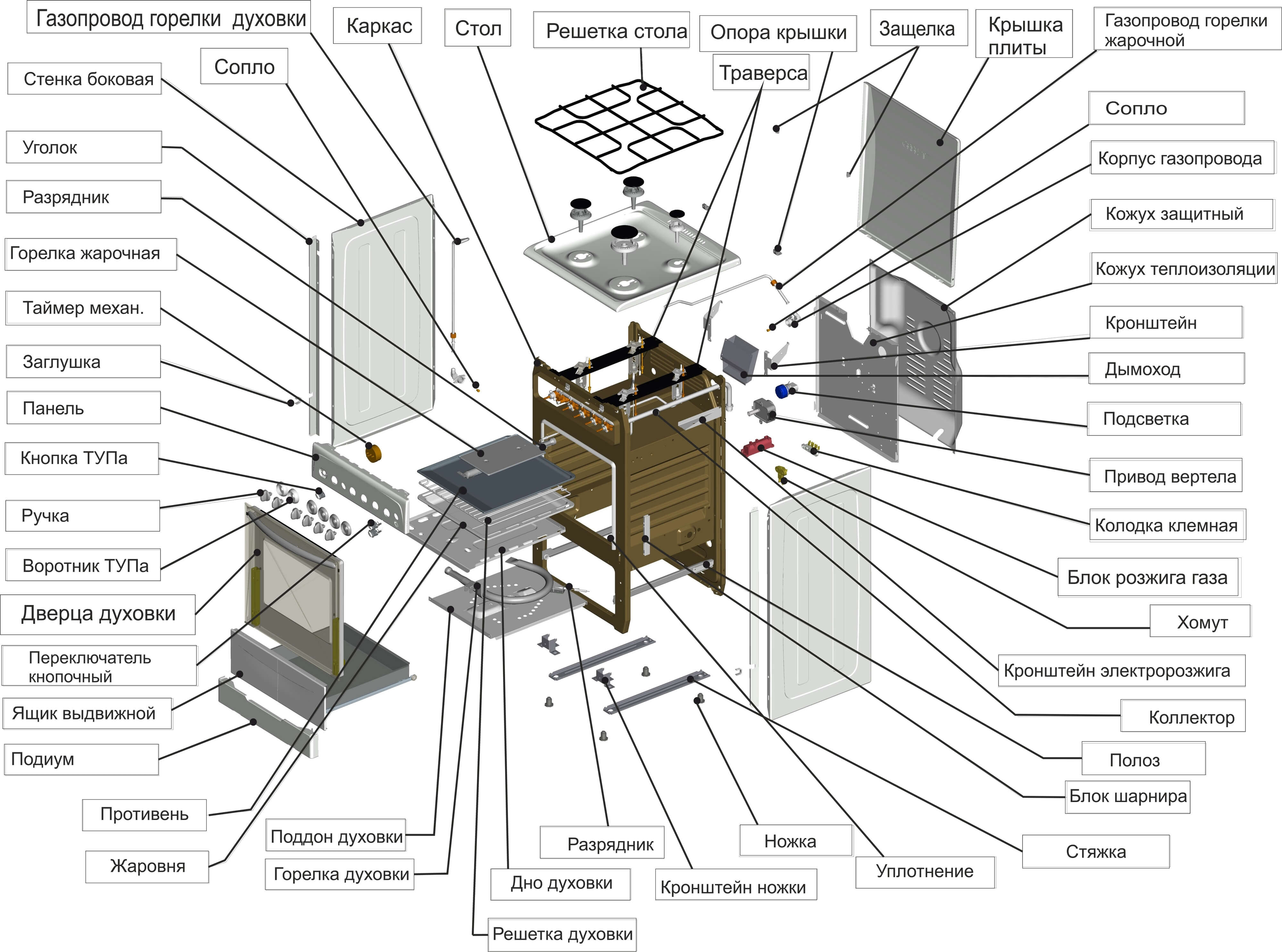 Les fabricants de cuisinières à gaz améliorent constamment leurs produits, mais le principe de fonctionnement de base reste le même. Par conséquent, la conception des cuisinières à gaz de différents modèles n'est pas très différente les unes des autres. Chaque modèle se compose de :