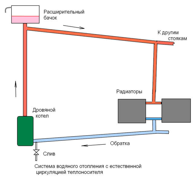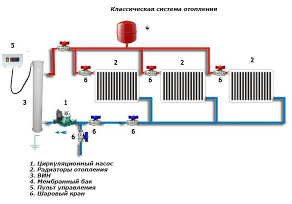 Un autre point fondamental qui distingue la conception des systèmes de chauffage avec un type naturel de circulation d'eau est le schéma de connexion des éléments chauffants.