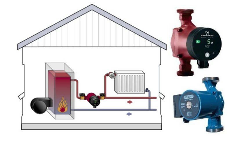 Les pompes utilisées peuvent différer selon le type d'application. Par exemple, les sèches n'entrent pas en contact avec le liquide de refroidissement pendant le fonctionnement. Les pompes humides pompent l'eau lorsqu'elles sont immergées. Les types de pompes sèches sont bruyants et le schéma d'installation de la pompe dans le système de chauffage convient mieux aux entreprises qu'aux locaux résidentiels.