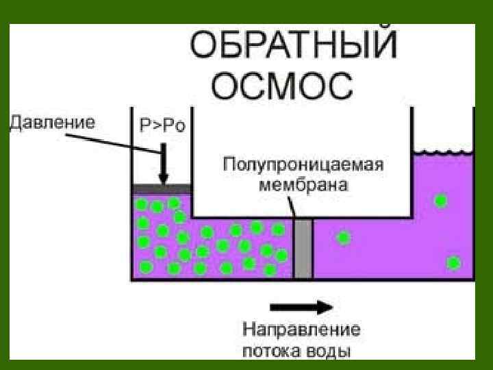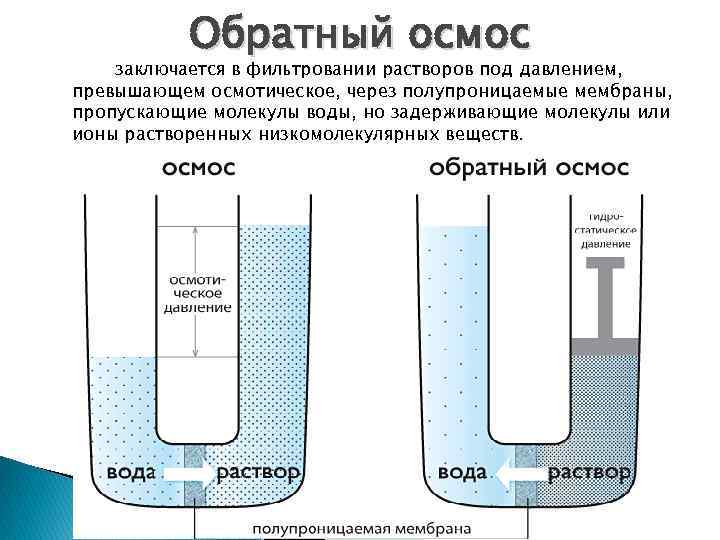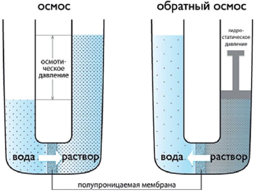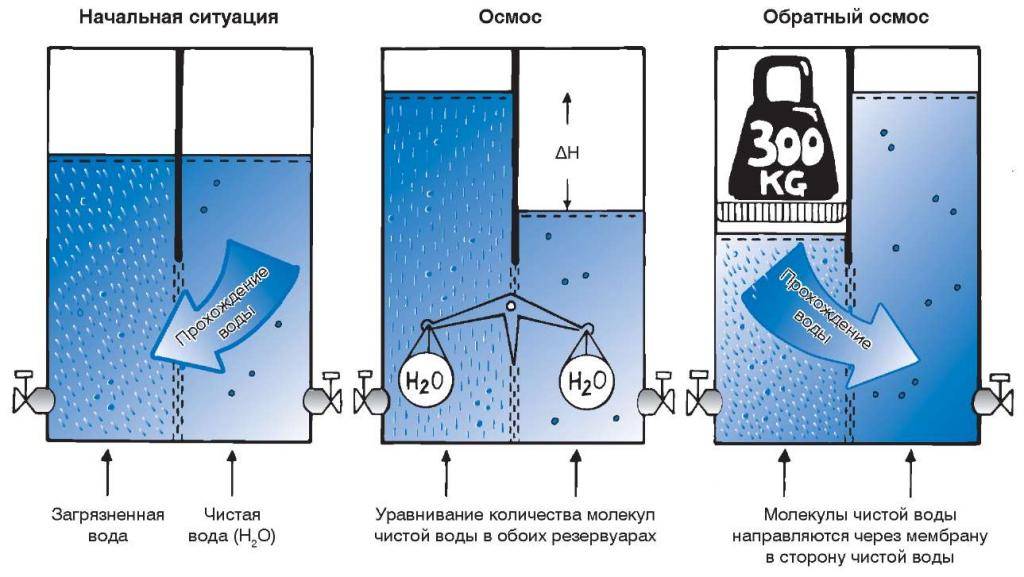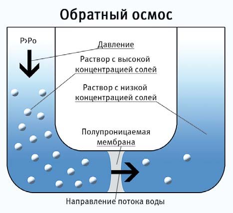Le processus d'osmose est basé sur la propriété de l'eau d'égaliser le niveau d'impuretés dans des solutions séparées par une membrane. Les trous de cette membrane sont si petits que seules les molécules d'eau peuvent les traverser.