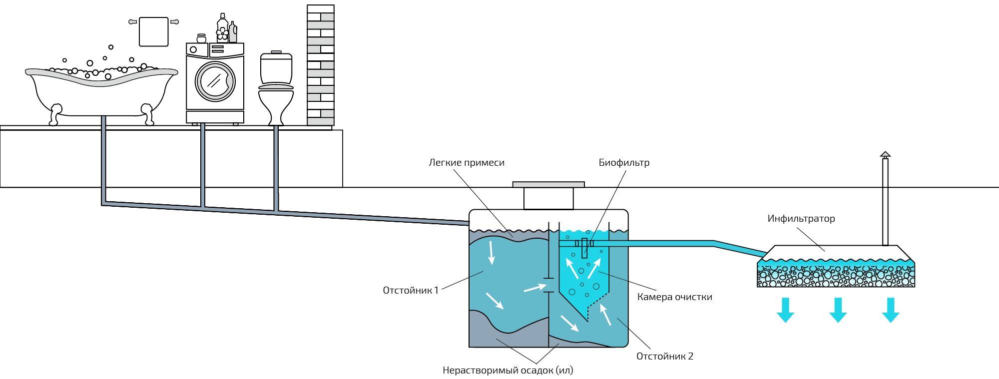 Dans les fosses septiques non volatiles, décanteurs, traitement, clarification, désinfection et purification de l'eau se produit en raison du flux de processus chimiques, physiques et biologiques naturels