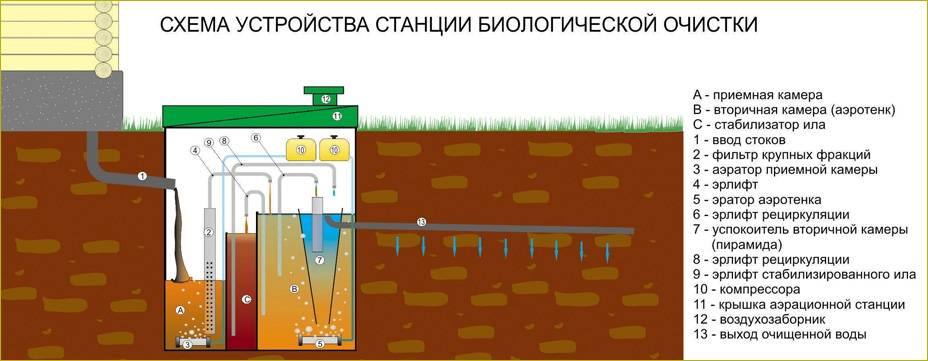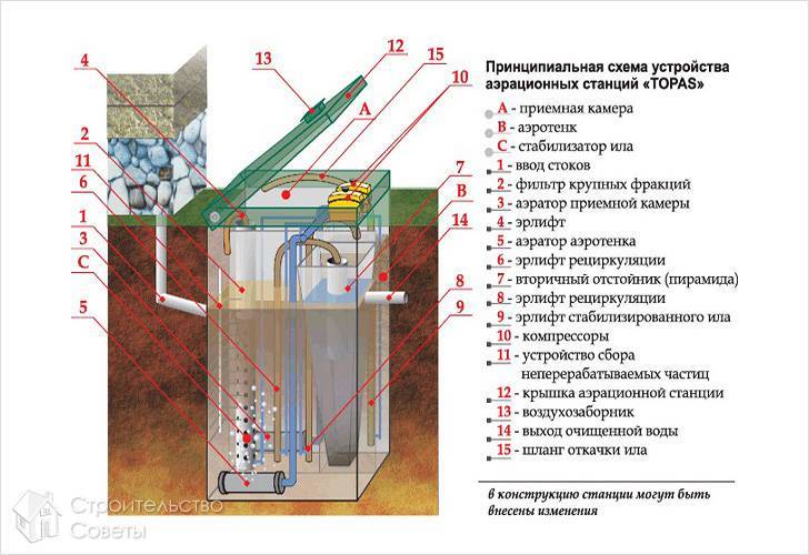 Les chambres de la fosse septique sont séparées par des cloisons. Le mouvement du fluide entre eux s'effectue par des tuyaux de trop-plein. Un tuyau de vidange est relié au premier compartiment à partir des égouts internes de la maison, et de l'eau purifiée est évacuée de la dernière chambre dans le sol ou de l'eau semi-purifiée pour la purification du sol.