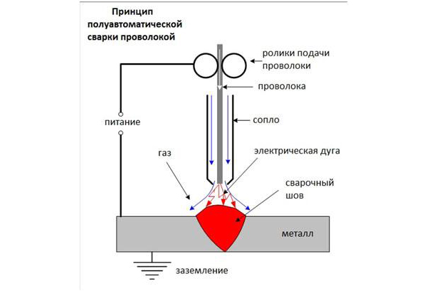 Le gaz protecteur est l'argon, le dioxyde de carbone, l'hélium ou des combinaisons de ceux-ci dans certaines proportions. La technologie de soudage semi-automatique se produit en faisant passer le fil à travers une buse à gaz, grâce à laquelle il fond. La longueur de l'arc est contrôlée automatiquement, tandis que la direction du mouvement + la vitesse restent sous le contrôle du soudeur. La méthode de travail peut être effectuée sans coque à gaz - un fil spécial auto-blindé est utilisé entrecoupé de silicium, de manganèse et d'autres éléments métalliques aux propriétés désoxydantes.