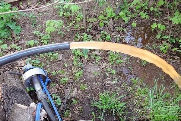 - Évacuation de l'eau analphabète. L'eau sale pompée doit être évacuée aussi loin que possible. Sinon, il peut à nouveau tomber dans le puits, puis le processus d'accumulation peut durer presque indéfiniment.