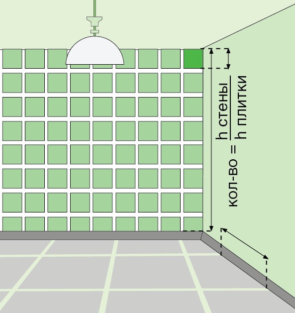 Vous devez maintenant calculer le nombre de rangées de tuiles lumineuses et son nombre total. On sait que la hauteur de la pièce est de 2,6 m, la hauteur de la couche sombre est de 0,9 m et la hauteur du trottoir est de 00,8 m. Il s'avère que 2,6 - 0,9 - 00,8 = 1,62 m - la hauteur de la lumière couche. Le nombre résultant est divisé par la hauteur de la dalle et le nombre de rangées est de 1,62 / 0,3 = 5,4, soit 5 rangées d'une dalle entière et une garniture sous le plafond.