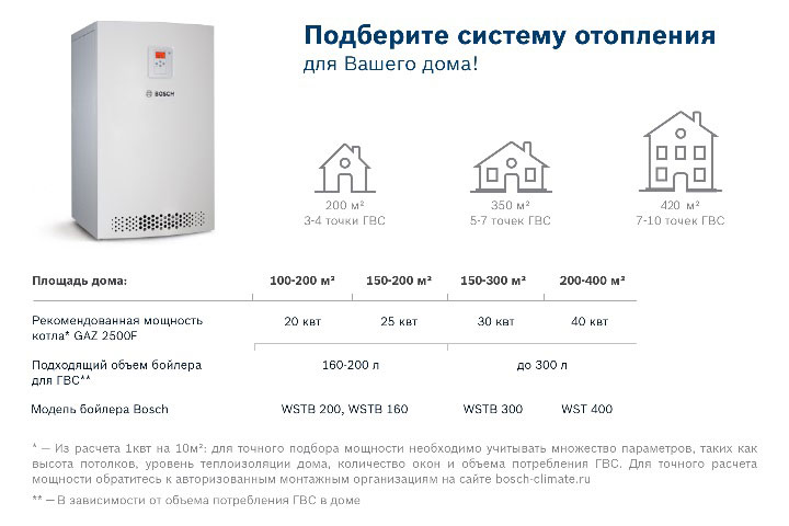 Dans le cas où le type d'appareil requis n'existe pas dans le réseau de distribution, une modification avec une taille de kW plus grande est achetée. Une méthode similaire ira pour les sources de chauffage à circuit unique, sans charge sur l'alimentation en eau chaude, et peut être utilisée comme base pour calculer la consommation de gaz pour une saison. Parfois, au lieu de la surface habitable, le calcul est effectué en tenant compte du volume du bâtiment résidentiel de l'appartement et du degré d'isolation.