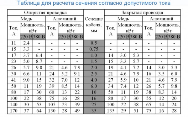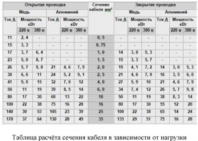 - Ensuite, nous recherchons les valeurs obtenues dans un tableau spécial pour calculer la section du fil. Pour une plus grande garantie, il est recommandé d'ajouter 10-15% à la valeur obtenue de la consommation électrique.