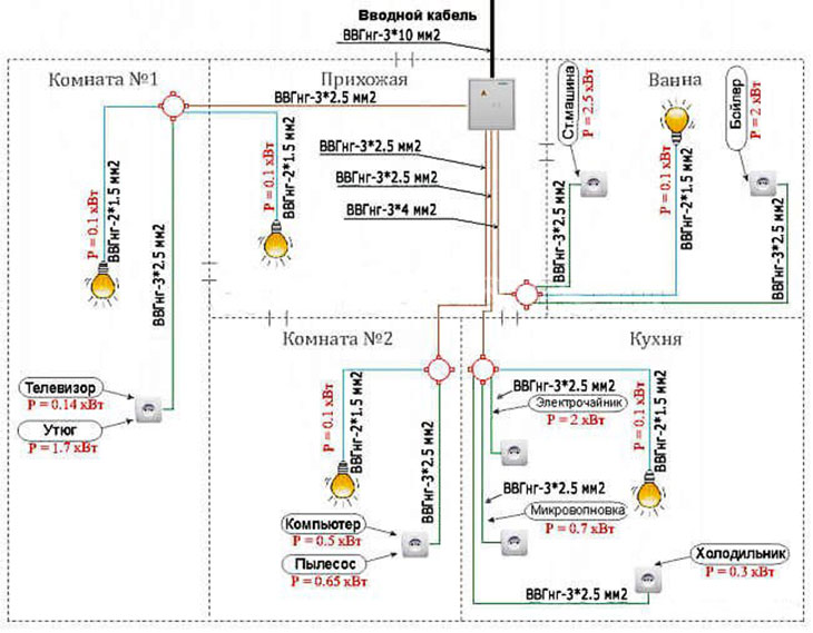 Mais revenons au calcul de la section transversale du câblage. Lorsque vous avez déterminé le câble d'entrée, vous pouvez procéder au calcul de la section des câbles et des fils pour les prises et les luminaires. Sur la base des données du tableau, il devient clair que des fils de 0,5 mm² doivent être utilisés pour l'éclairage et de 1,5 mm² pour les prises.Mais souvent, ils installent des fils plus puissants: pour éclairer au moins 1,5 mm² et pour les prises - à partir de 2,5 mm², à moins, bien sûr, que la puissance des appareils ne corresponde au fil.