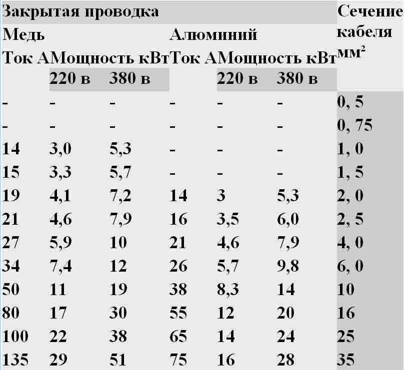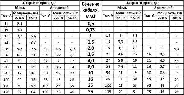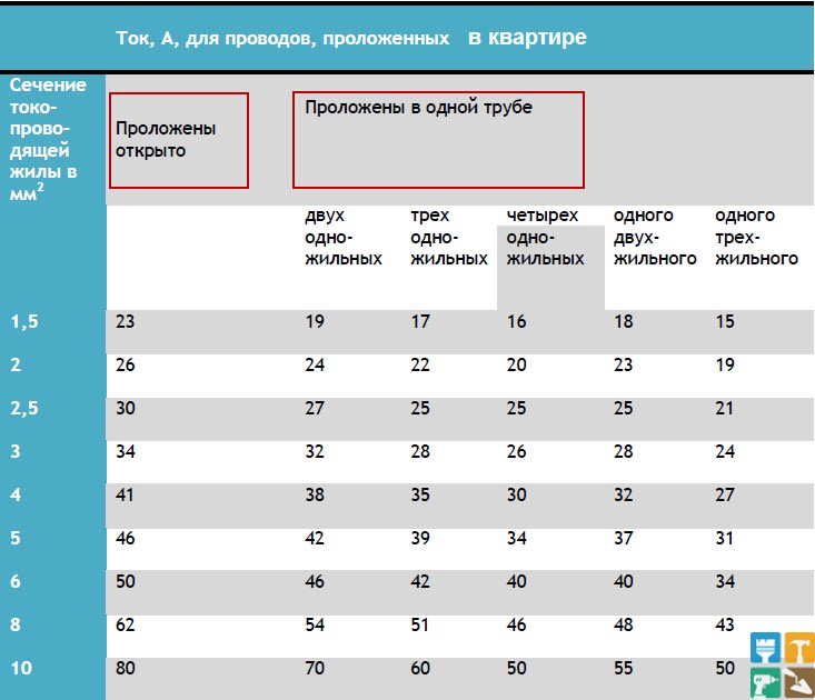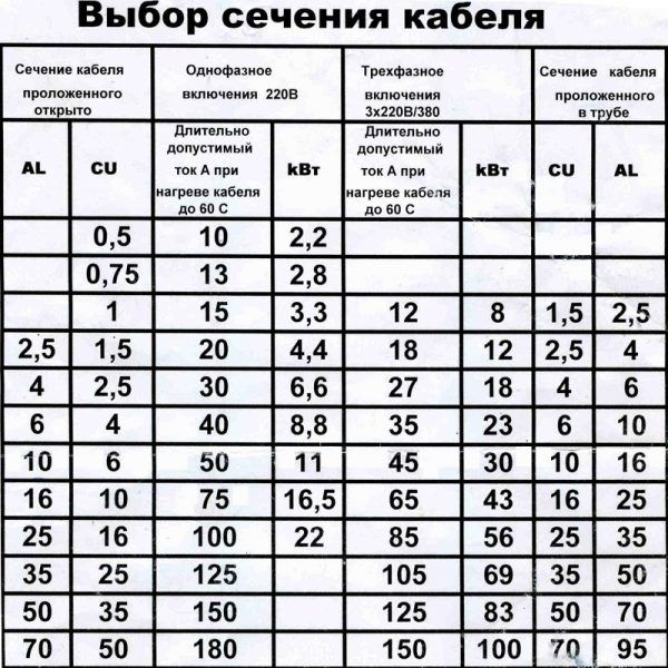 Nous obtenons le courant de ce circuit 10 ampères. Selon le tableau, nous regardons la section du câble. Elle est égale à 2,5 mm 2 pour le cuivre. Nous ne prenons pas en compte les câbles en aluminium.