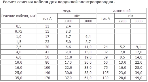 Après avoir trouvé la valeur souhaitée, il ne sera pas difficile de sélectionner la section de câble. Pour cela, il existe un autre tableau qui montre les dépendances de la section du câble, de la puissance et de la tension. Il affiche des données pour les câbles en cuivre, car personne n'utilise l'aluminium aujourd'hui.