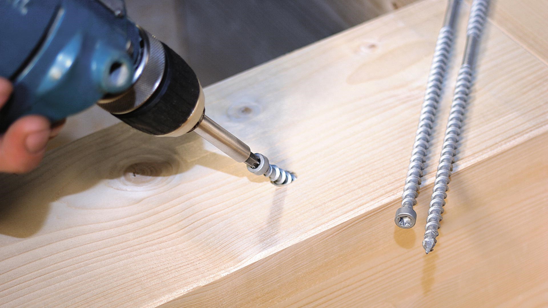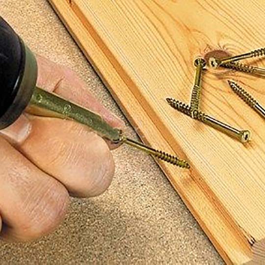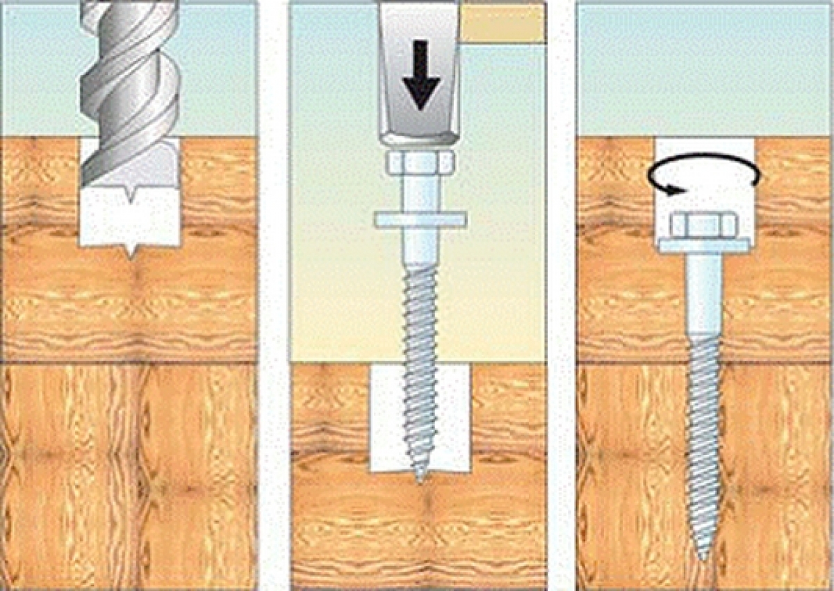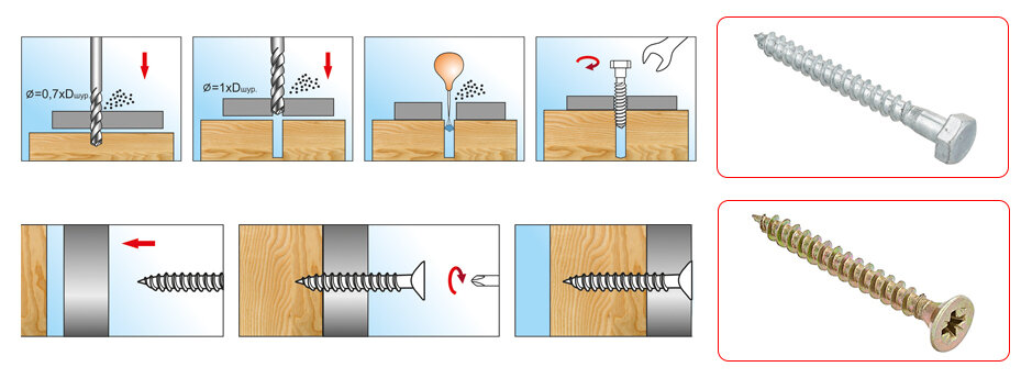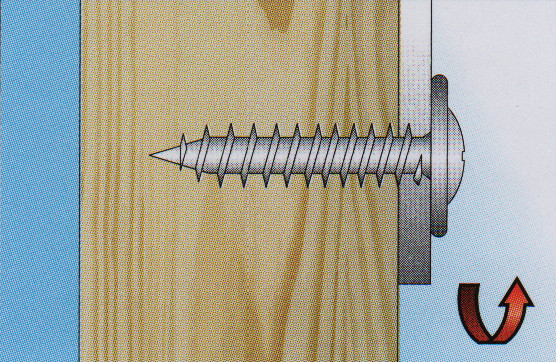 Naturellement, dans ce cas, vous devez à nouveau utiliser des vis autotaraudeuses avec filetage pour le bois. S'ils sont vissés dans des planches ou des dalles minces, ainsi que dans des bois durs, un mince trou de réception doit d'abord être percé. La façon la plus simple de travailler avec des planches épaisses en bois résineux : aucune astuce n'est nécessaire pour cela.
