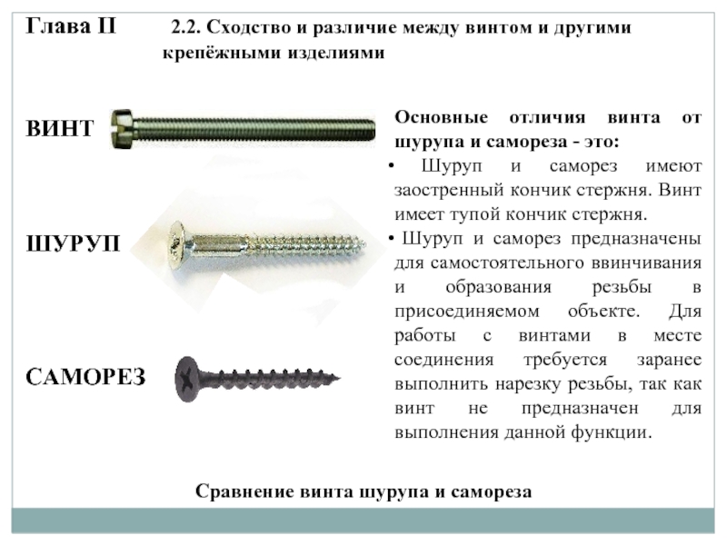 - il s'agit d'une attache dont le noyau est fileté au 2/3 et sur le capuchon il y a une fente ou une encoche en forme de croix pour un tournevis. Afin de ne pas confondre une vis avec une vis (qui n'est pratiquement pas utilisée en menuiserie), rappelons que la vis a une extrémité effilée. Les vis autotaraudeuses sont très populaires. Lorsqu'ils sont vissés, ils créent un filetage dans le trou de connexion. Les vis autotaraudeuses, comme les vis simples, peuvent être de différentes longueurs et épaisseurs, avec différentes fentes et formes de tête, mais sur une vis autotaraudeuse, le filetage est fait sur toute la longueur, jusqu'à la tête elle-même - c'est leur principale différence visuelle.