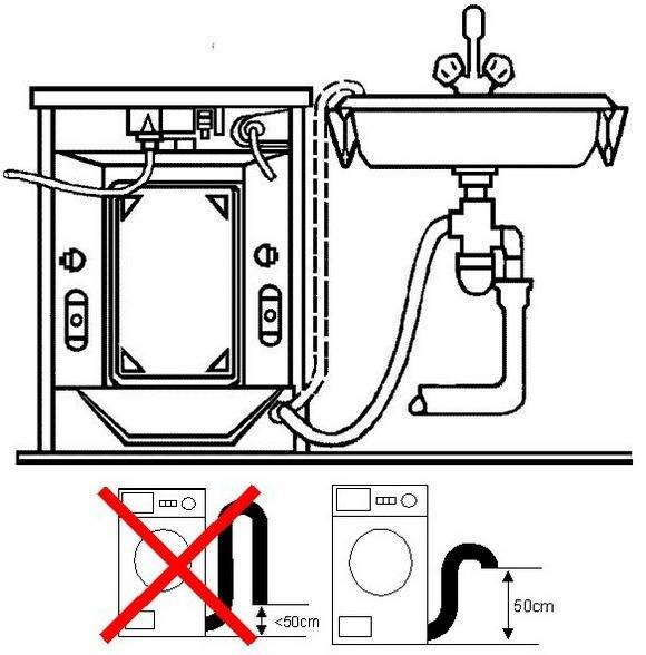 Il est également nécessaire de clarifier certaines des nuances de l'emplacement du tuyau de vidange. Pour un bon fonctionnement de la vidange, il est nécessaire de s'assurer que le tuyau de vidange monte à une hauteur supérieure au niveau d'eau dans le lave-linge (au moins 50 cm).